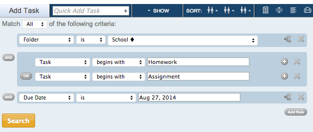 Search with Toodledo's powerful search functionality that allows you to easily construct simple or complex rules that will find matching tasks. Once you have made the perfect search, you can save it for quick access on return visits. Additionally, with the Multi-Edit tool, you can quickly find and edit a bunch of tasks at the same time.